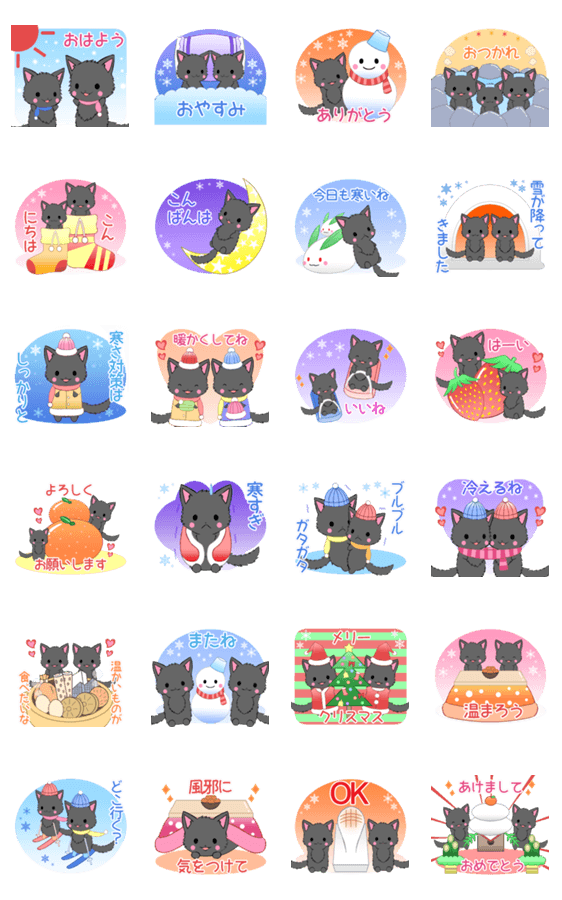 小さいもふもふにゃんこ(黒)たちのスタンプ第8弾。 ねこ/ネコ/猫/かわいい/可愛い/キュート/黒猫/もふもふ/モフモフ/挨拶/日常会話/シンプル/雪/クリスマス