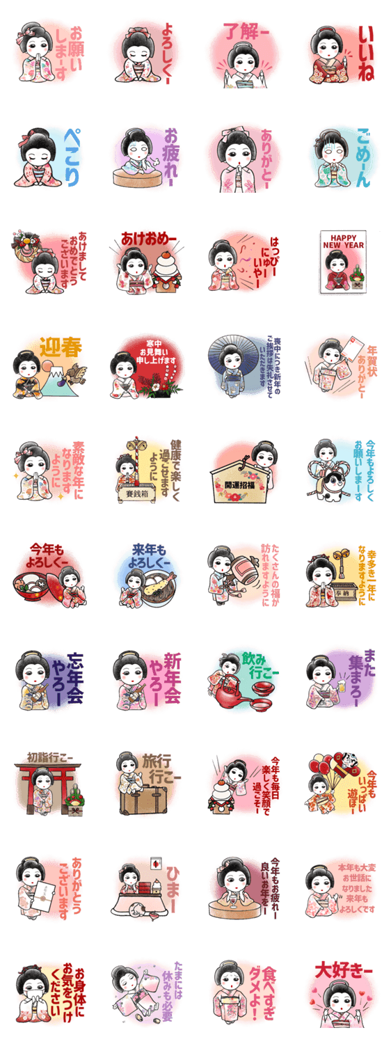 年末年始によく使う言葉を和風のイラストで表現したスタンプです。着物の女の子が新年のご挨拶をします。ポップな和風柄がお正月にぴったり!
