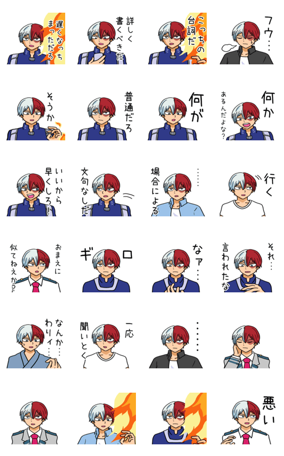 僕のヒーローアカデミアの轟焦凍のスタンプです。私服・雄英高校の制服、体操服姿、病衣の轟くんです。ヒロアカ/とどろきしょうと/ショート/毎日使える/文字に白縁取り有 ※LINE Creators Collaboration 僕のヒーローアカデミア参加スタンプです。