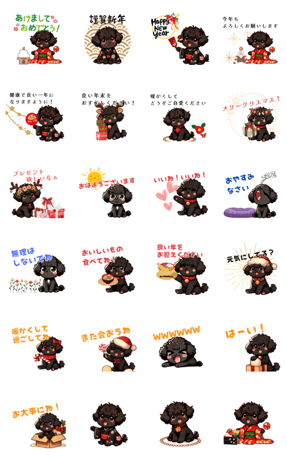 | スタンプ説明 | 黒いマルプーちゃんの年末年始に使えるスタンプです! クリスマスやお正月の挨拶など |