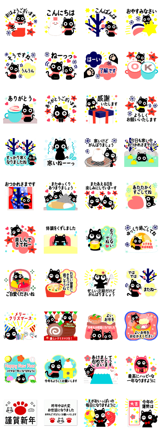 丸い目の真っ黒クロネコのスタンプです。冬に使える豪華なセットです♪黒猫/クロネコ/くろねこ/可愛い/日常/挨拶/ねこがすき/冬/クリスマス/お正月/年賀状/年末年始/雪