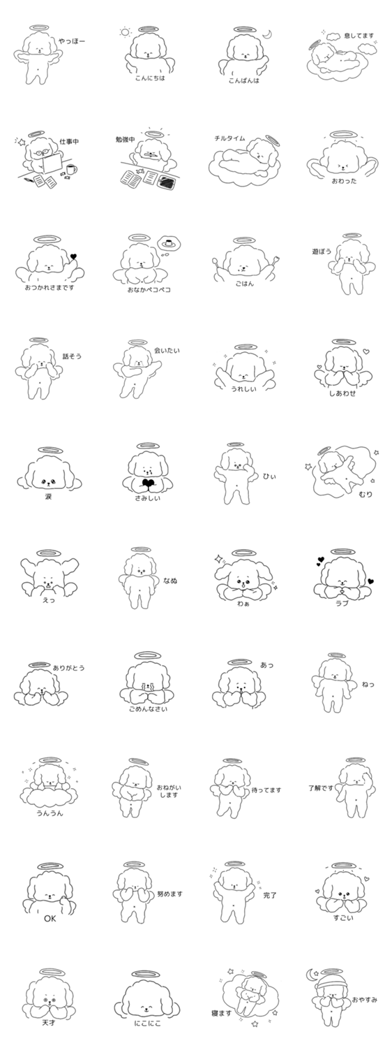 天使をモチーフにした犬のスタンプです♡線画のみ背景色なしですので、トーク背景が鮮やかな場合は見えにくい可能性があります。ご了承いただいた上、ぜひお迎えください。