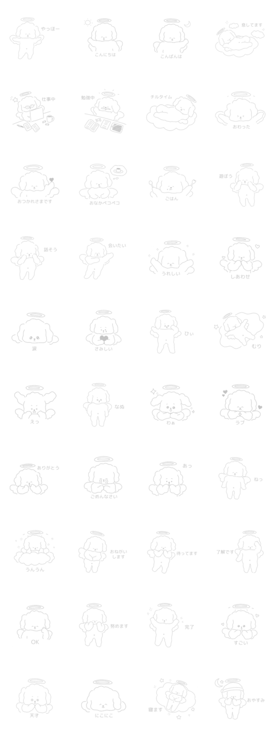 天使をモチーフにした犬のスタンプです♡線画のみ背景色なしですので、トーク背景が鮮やかな場合は見えにくい可能性があります。ご了承いただいた上、ぜひお迎えください。