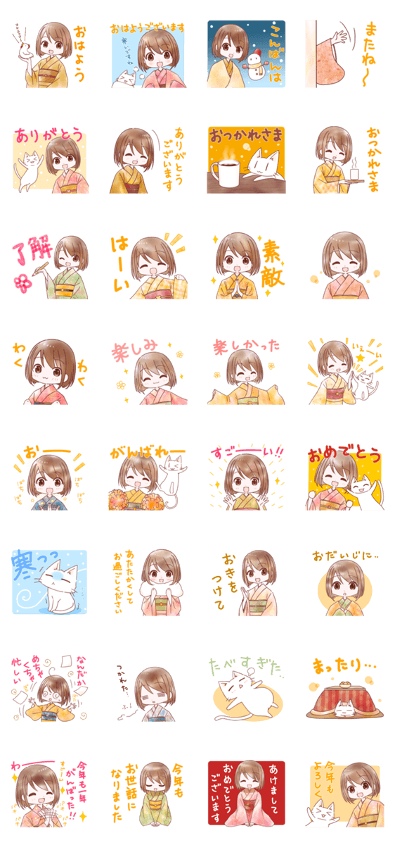 冬にほっこりする着物の女の子と猫のスタンプです。 日常、寒い日、年末年始にどうぞ。