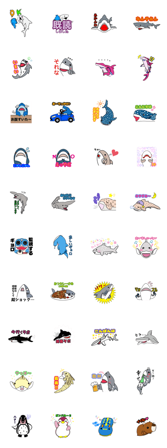 先住民藤豆&藤雪、長男の藤代をはじめ藤田、藤吉、藤六、藤餅、藤大、藤八、藤鬼、藤美、藤松、藤音、藤樺、藤山、藤ターボ、藤すき、藤虎、藤酒のサメ家族と友達スタンプ
