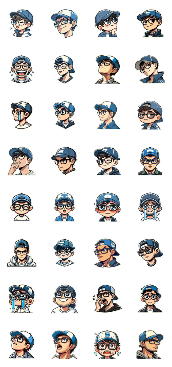 キャップとメガネがトレードマークの男子が、笑い・驚き・怒りなど豊かな表情で日常を彩るスタンプです!使いやすさ抜群!