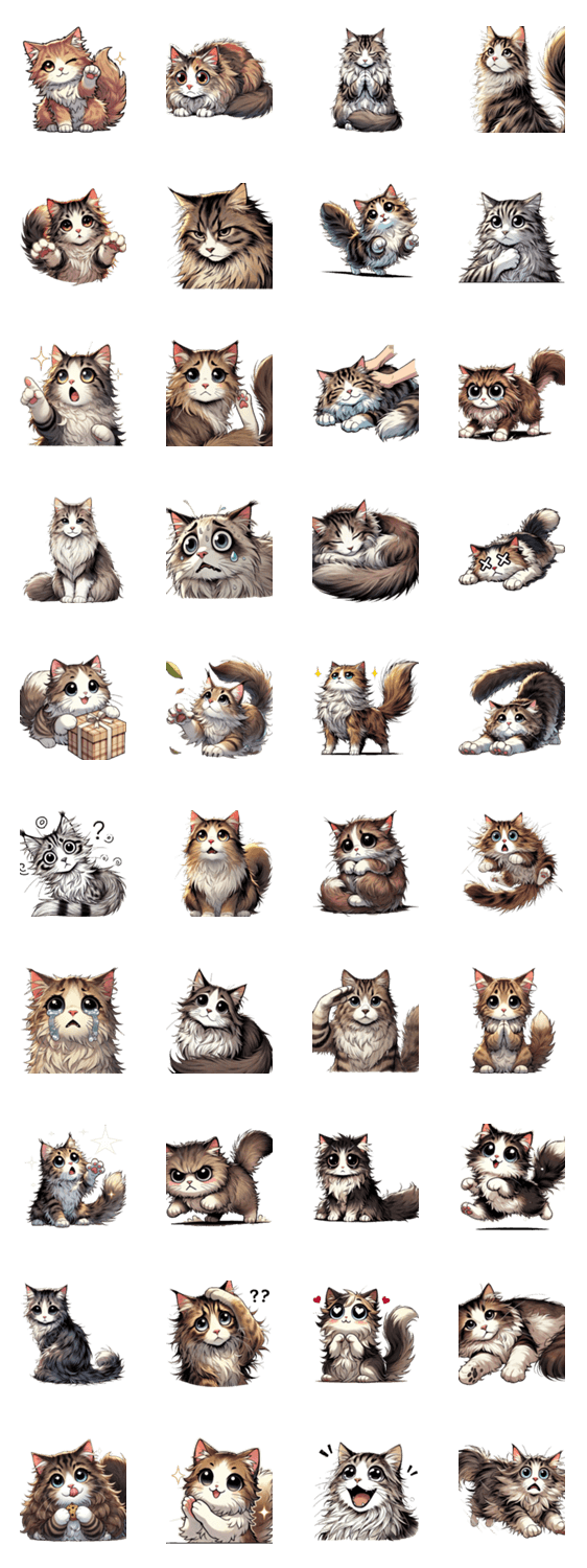 ふわふわのノルウェージャンキャットがトークを癒します。シンプルで可愛いスタンプで、友達や家族に優しい気持ちを届けよう!
