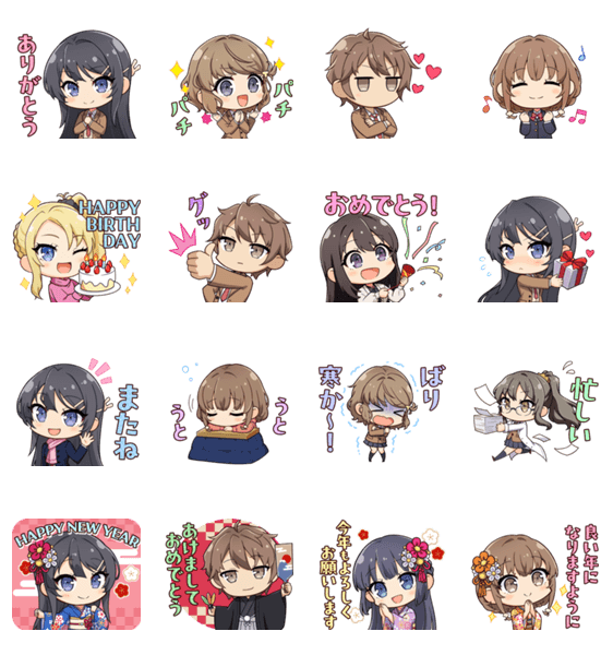 | スタンプ説明 | アニメ「青春ブタ野郎」シリーズのミニキャラLINEスタンプが登場! 誕生日、お正月などお祝い事にぴったりなスタンプも♪ |