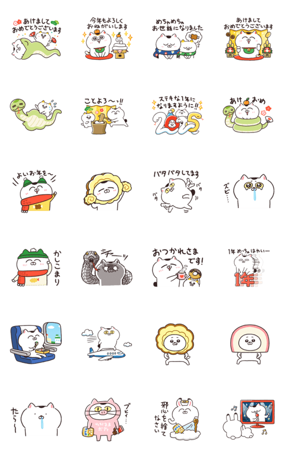 ねこちゃんだものシリーズに年末年始のあけおめスタンプが登場! 2025年の巳年に使えるヘビスタンプや通常の年末年始の挨拶までもりだくさん!招きにゃんこも入れました♪