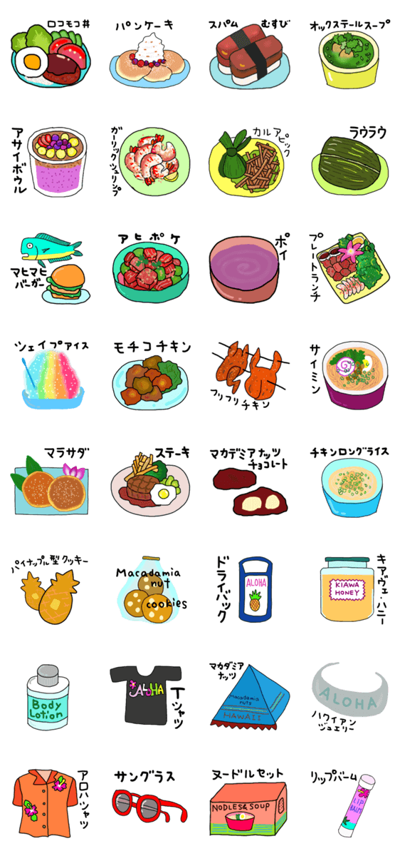ハワイの美味しい物やお土産のスタンプです