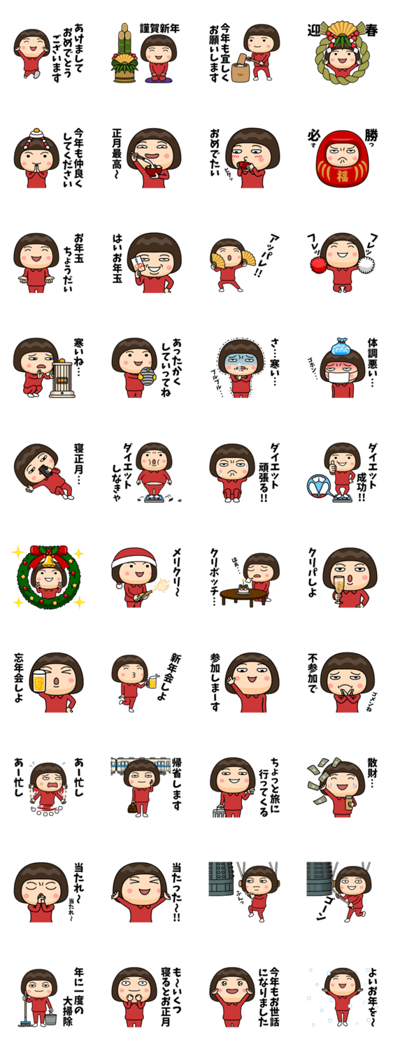 芋ジャージ女子の『決めポーズの年末年始』。年末年始、冬休み、お正月、クリスマス等に使える静止画スタンプの番外編。
