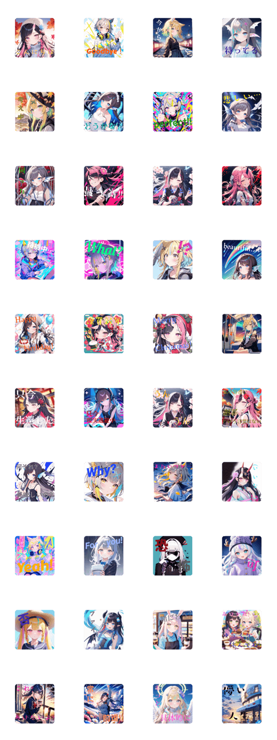 AI画像を元に作成した3人の女の子のスタンプです。後半にはその3人以外にも女の子が載っています。普段使いもしやすいスタンプなので是非買ってみてはいかがでしょうか?