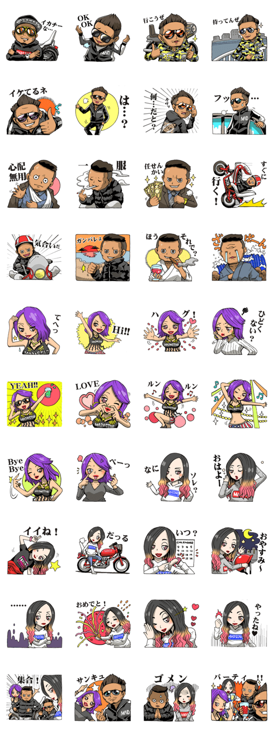 マッドスター(MAD★STAR)のLINEスタンプ。アウトロー達に人気のジャパニーズヤンキーバイカースタイル(Japanese Yankee Biker Style)。DAIKI&SENA&本田&ミクル