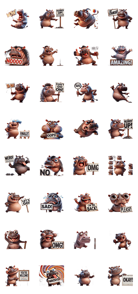 おっとりカバ「なんてこった」絵文字スタンプ、面白い、驚き、動物、感情的、ユーモア、LINEスタンプ、イラスト、交流
