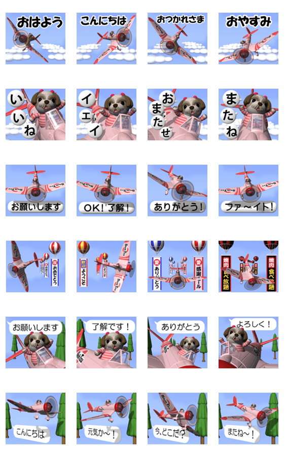 | スタンプ説明 | パイロットのシーズーさんが飛行機に乗って大空を飛び回ります。 |