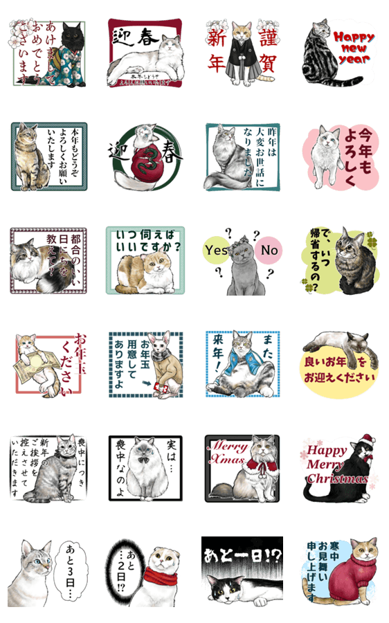 家族や友達や仕事関係まで使える年末年始美麗猫スタンプフルセット。喪中対応※2024販売したスタンプの再販です