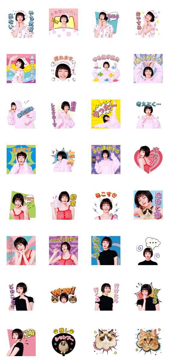 | スタンプ説明 | 池田エライザのスタンプが遂に登場! 池田エライザと大好きな猫ちゃんと一緒にトークを楽しもう♪ |