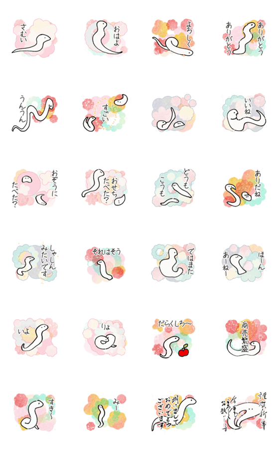 もはや蛇なのかわからない。なんとなく年末年始につかえそうな、使えなさそうなアニメーションスタンプです。親しい人に送ってください。お正月/クラスメイト/巳年/モチ