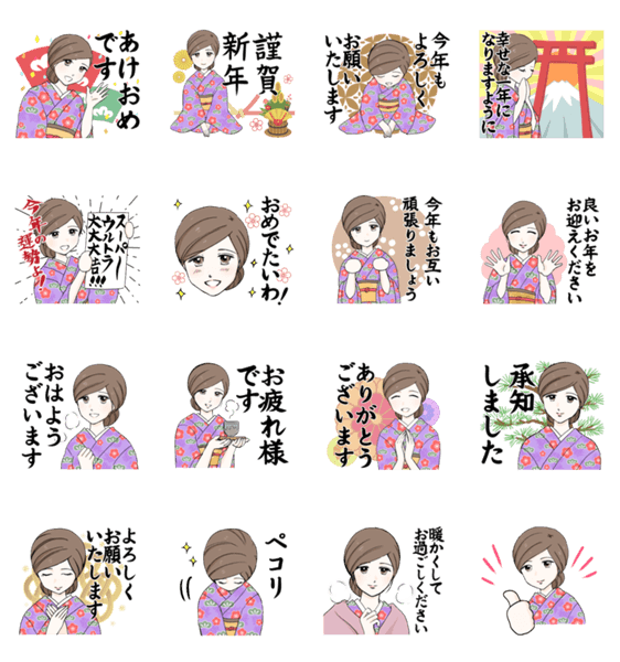 | スタンプ説明 | お仕事先や家族、友人への新年のご挨拶に使えるおかみさんスタンプ✨定番のあいさつもあるので毎日使えます♪(あけおめ/年賀状/年末年始/敬語/職場/着物/大人/和風/筆文字) |
