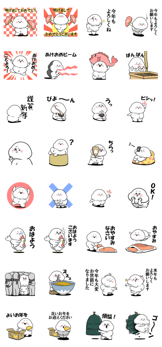 ちょっと太っておデブさんになってしまった白丸くんの年末年始に使えるであろうあけおめスタンプです。2024年度のあけおめスタンプを毎年使えるように改正したものです。