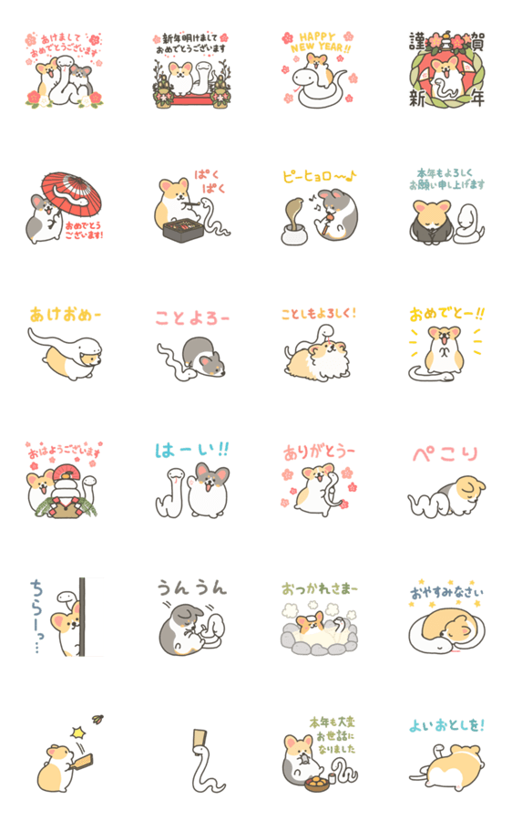 コーギーとヘビの動くスタンプです。新年のお祝いに蛇コギの成分が欲しくなったらお使いください。