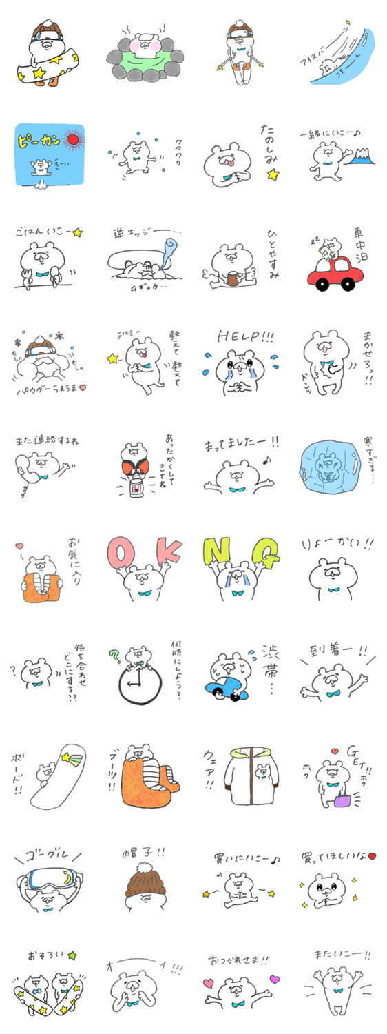 ふでねこフレンズのアクティブ担当のぺんくまです。スキーやスノボ、温泉など、冬のイベントや日常の一コマにお使いください。組み合わせは無限大です。