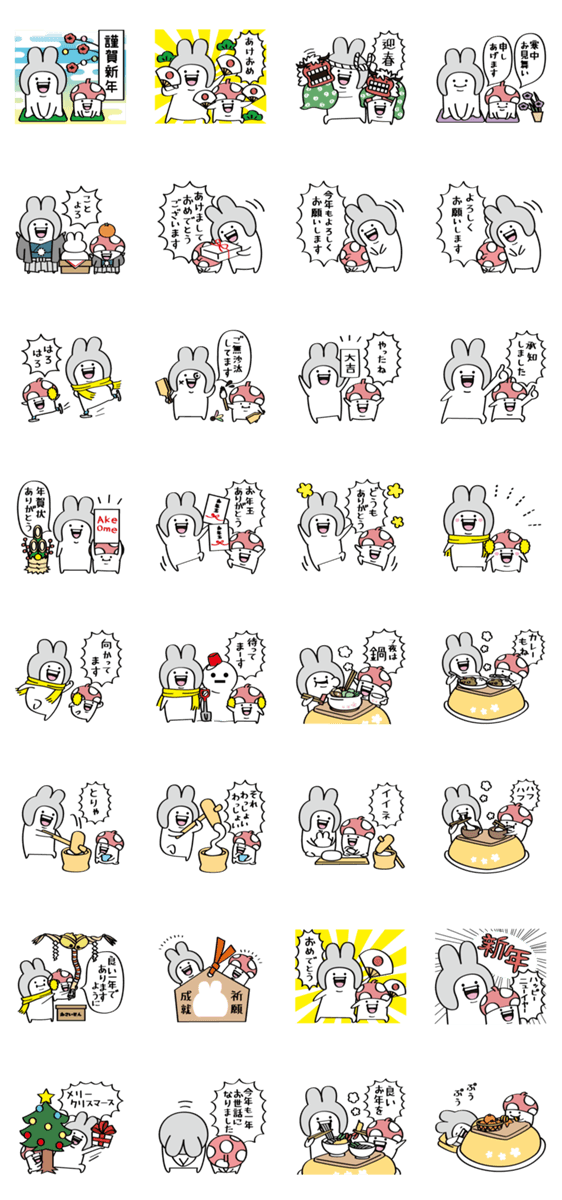 うさぎ?はたまた宇宙人?かもしれないうさぎとベレー帽をかぶっているキノコ?はたまた宇宙人?の冬スタンプ。年末年始のご挨拶にも使えます。