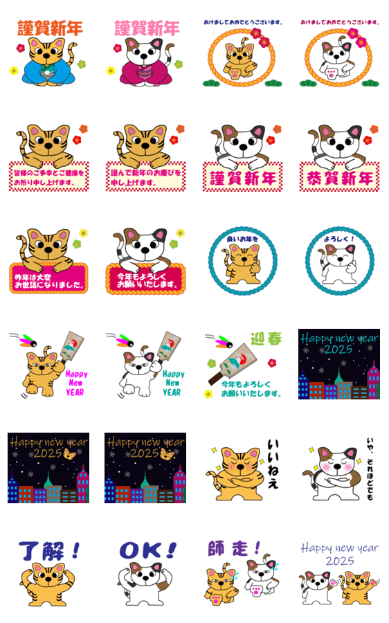 | スタンプ説明 | 虎猫と三毛猫をモチーフにしたスタンプのあけおめバージョン! |
