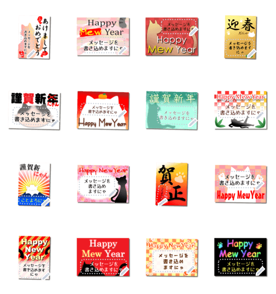 年賀状・猫耳富士山・迎春・Happy “Mew“ yearなど年末年始の挨拶に使いやすいハガキ型の文章を書き込めるメッセージスタンプですにゃ♪謹賀新にゃん♥猫部の方に♪ 現在この商品は一部のスマートフォン版LINE 10.3.0以上のトークルームでのみ使用できます。動作環境の最新情報はヘルプをご確認ください。