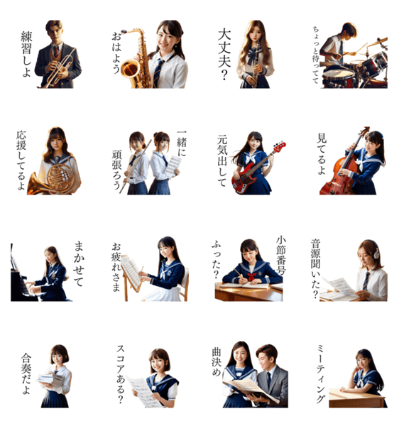 吹奏楽部あるあるを詰め込んだスタンプです。AI部員と一緒に、吹部で青春しよ⭐︎