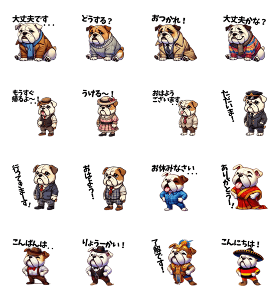いろんな服を着たおしゃれなブルドッグたち。