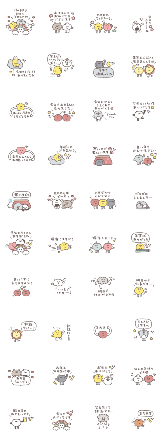 年末年始に一つあると便利なゆるかわな生き物のあいさつスタンプです。 あいさつ/スマイル/手書き/くすみカラー/ペンギン/パンダ/トリ/うさぎ/くま/ねこ/年末年始