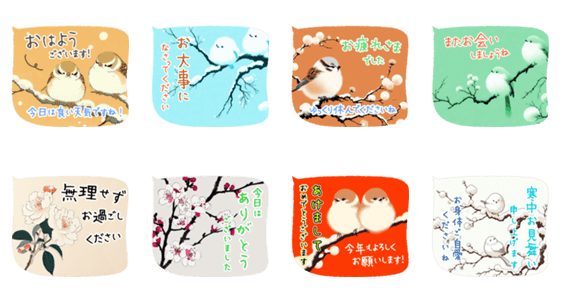 1年中使える 敬語で丁寧な挨拶や気遣いを伝える人気のLINEスタンプ.お母さん,おばあちゃんにぴったりの椿や鳥、風景が彩る上品なデザインで、新年や日々のご挨拶にぴったり