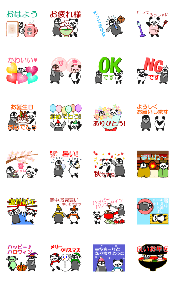 一年中使える、ペンギンとパンダのコンビの、アニメーションスタンプです。(新年、寒中見舞い、バレンタイン、暑中見舞い、ハロウィン、クリスマス、年末年始)