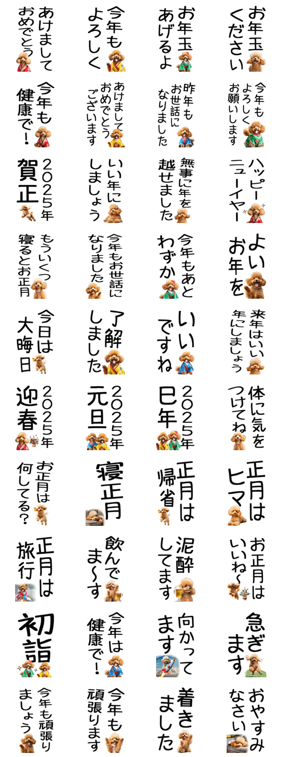 | スタンプ説明 | 老眼の人や細かい文字が苦手な方のためのお正月スタンプです。かわいいトイプードルが新年のご挨拶。年末から使えるスタンプもありますよ!!!柴犬バージョンもあります。 ※このスタンプはトークルームで大きく表示されるBIGスタンプです。 |