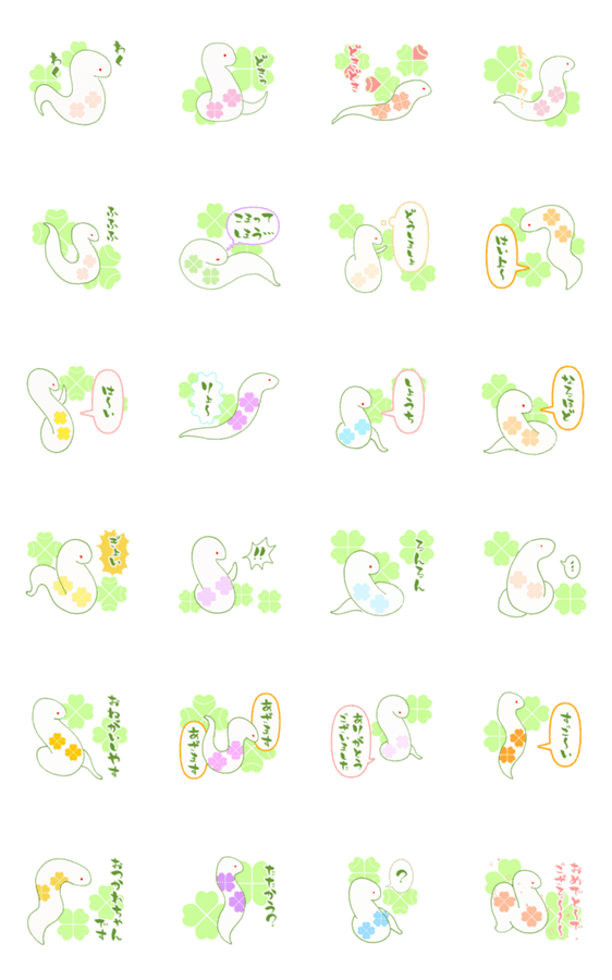 ちょっとふざけてる日常系のみの動くヤツ。よつ葉&白蛇で運気アップをねらいます。年末年始のおたわむれにどうぞ。あけおめスタンプはもっと派手なのをお使いくださいな。
