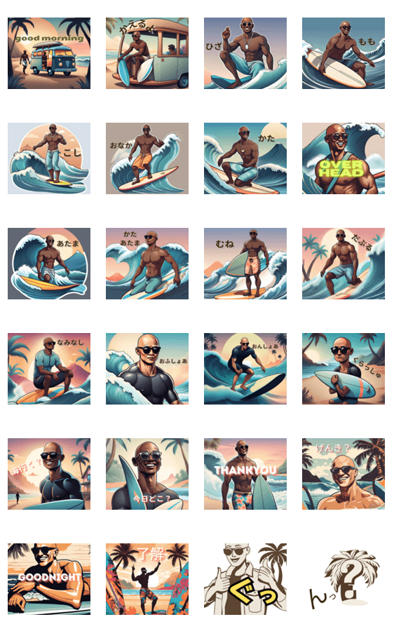 サーファー必見!波の大きさと日常会話を楽しむスタンプセットです。ヒザ波からダブルオーバーまで、会話をもっと楽しくしよう!