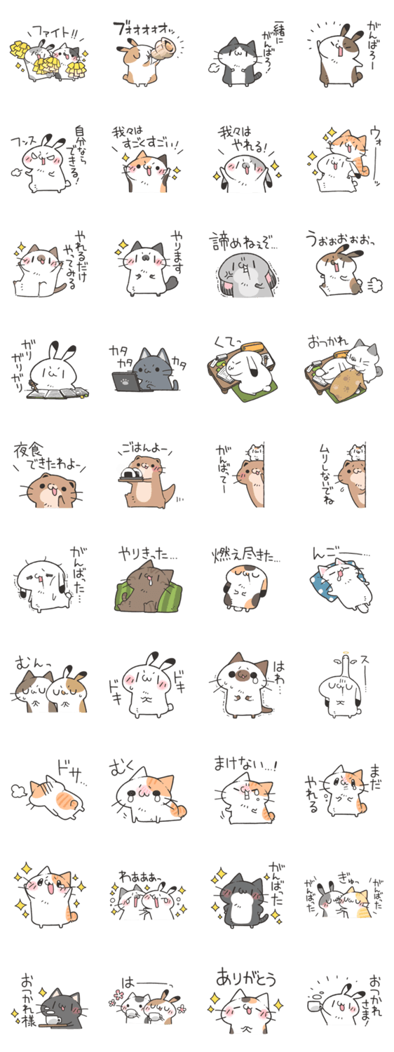 ゆるうさ、にゃんこ、カワウソの一緒に頑張るためのスタンプ!無理はせず、でも精一杯頑張ろう!