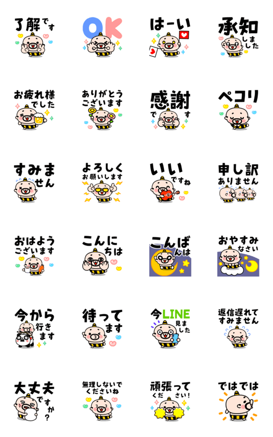 雷おやじ君の可愛い敬語スタンプ。基本的な挨拶と返事をそろえた使いやすいスタンプです。老眼にうれしいでか文字!