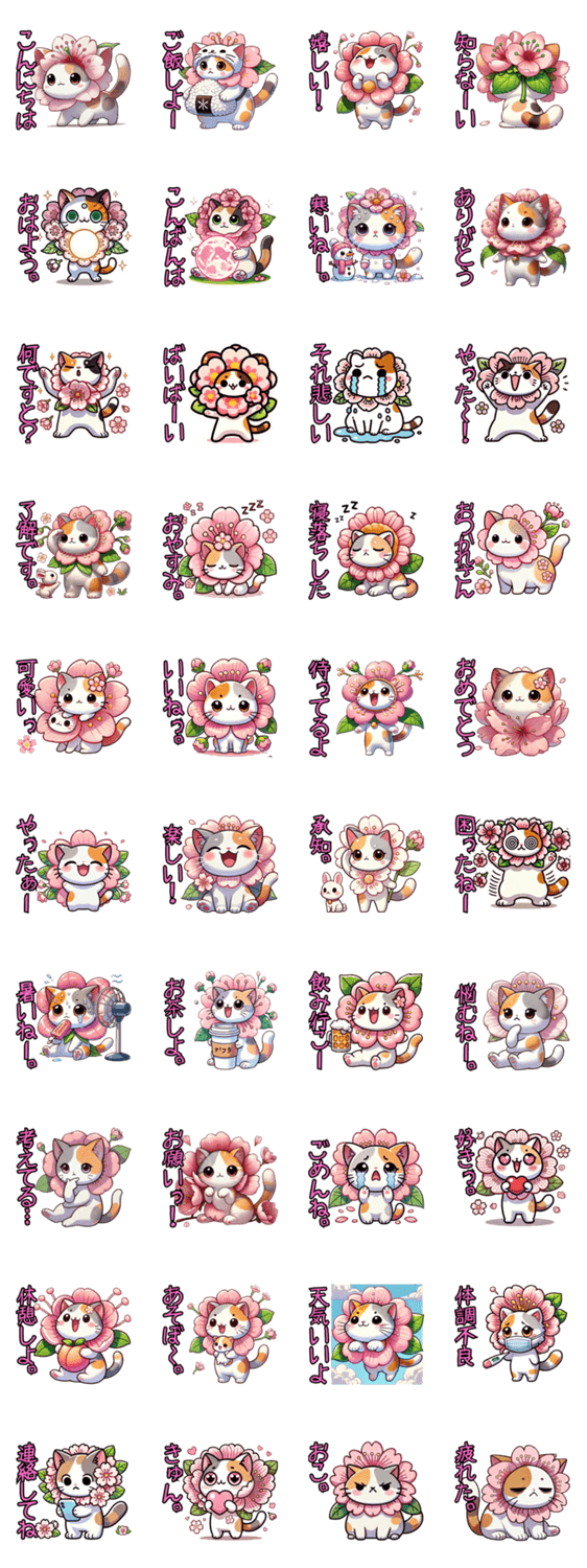 | スタンプ説明 | 花猫シリーズ第一弾の向日葵にゃんに続く弾二弾の桜にゃん。可愛すぎてごめんなさい。クリスマス仕様のポインセチアにゃんと共に可愛がってあげて下さい。ぬいぐるみ化は⁇ |