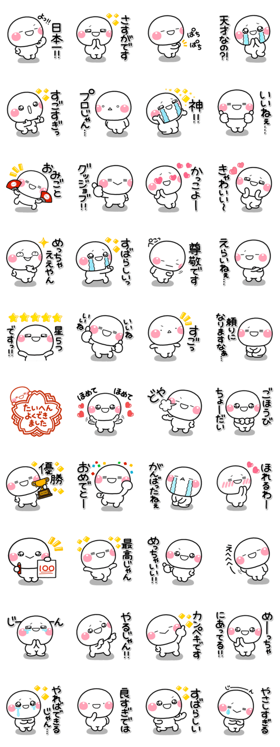 しろまるのみんなを褒めるやさしいスタンプです。ずっと使える内容を揃えましたのでスタンプ初心者の方にもオススメです。【作:いしいともこ】