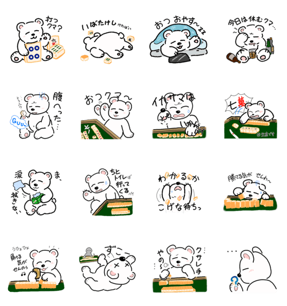何となくゆる~い感じのしろくまが、麻雀しているスタンプです。なぜか九州っぽいしゃべり方です