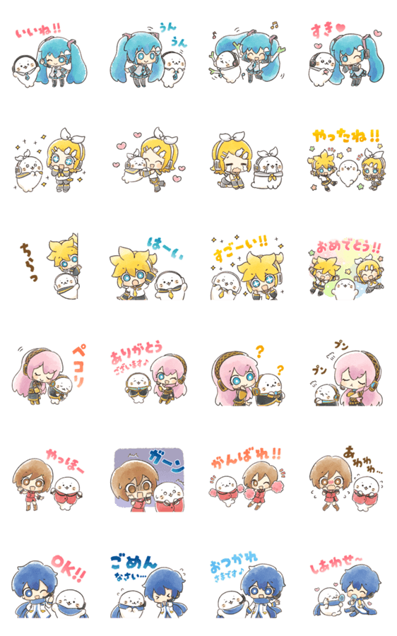 | スタンプ説明 | 初音ミクとしろたんのコラボスタンプが登場♪ミク、リン・レン、ルカ、MEIKO、KAITOたちピアプロキャラクターズと一緒にふんわりキュートにトークを盛り上げるよ♬ |