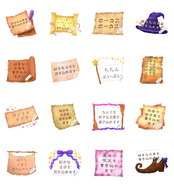文が書き込める♥羊皮紙の巻物や古紙フレーム・魔女の帽子・ブーツ・マジカルステッキ・星くずのキラキラファンタジーのメッセージスタンプ★ 現在この商品は一部のスマートフォン版LINE 10.3.0以上のトークルームでのみ使用できます。動作環境の最新情報はヘルプをご確認ください。