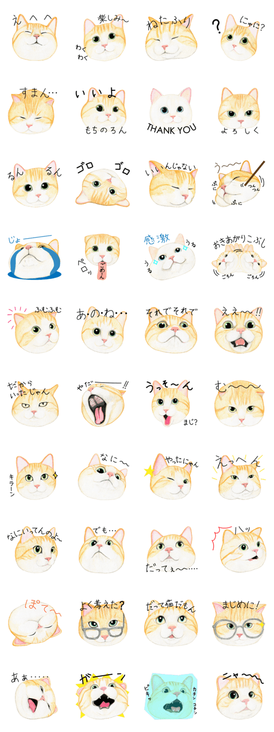 『むにゅっ』としたネコたちのスタンプです。マイペースで癒されるネコたち。茶トラねこ、たまに白猫もいます。「だって猫なんだもん!」そんなゆるいスタンプです。