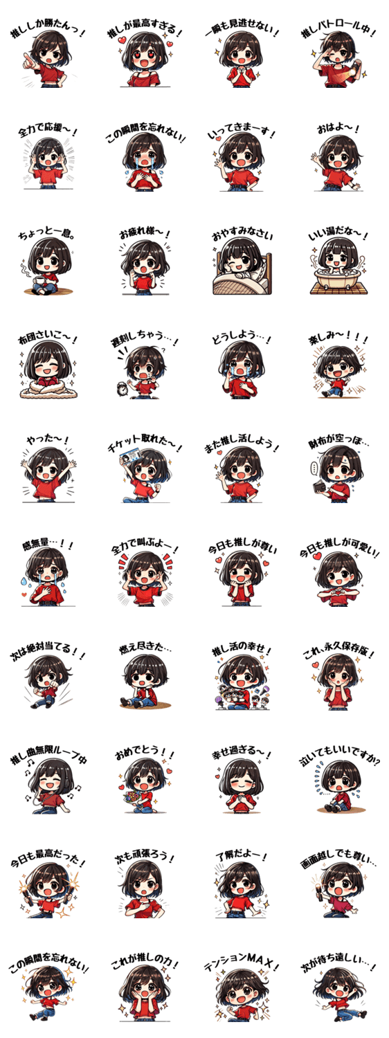 推し活を全力で楽しむファンの気持ちを表現したスタンプセット!推しカラーの赤を基調に、応援や感動、日常使いできる表現が満載。推しへの想いを届けるのにぴったりです!