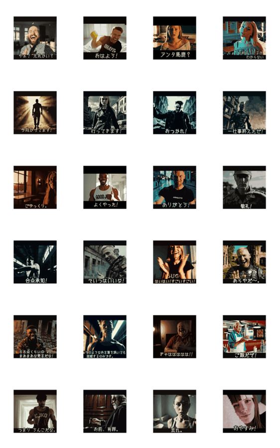 なんか映画っぽい感じの動くスタンプでございます。一年中使える、毎日使える、レトロ、外国人、美女、アニメーションスタンプ、シュール、煽り、面白い、オシャレ。