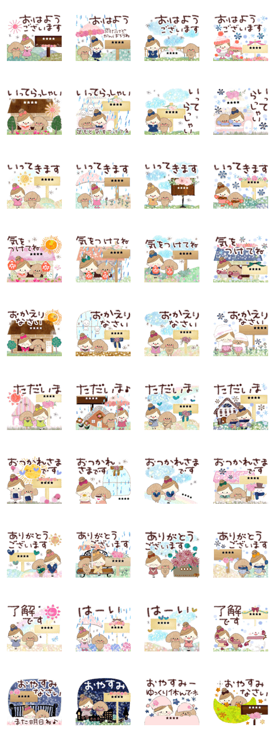 | スタンプ説明 | マフィの家族連絡スタンプ第3弾♪最大4文字まで名前や自由な言葉を何度でもいれ変えられます。晴れ・雨・曇り・雪など、その日の天候に応じてぜひ使ってみてね。 |