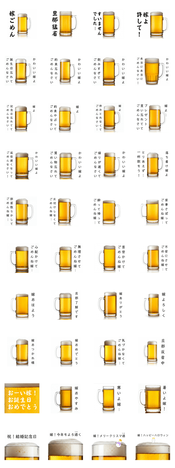 約束や記念日を忘れた旦那用、生ビール好きな嫁に謝罪するスタンプ♡とりあえず…謝ろう☆年中毎日使える/夫婦円満/妻/夫/家庭円満/家族/酒好き