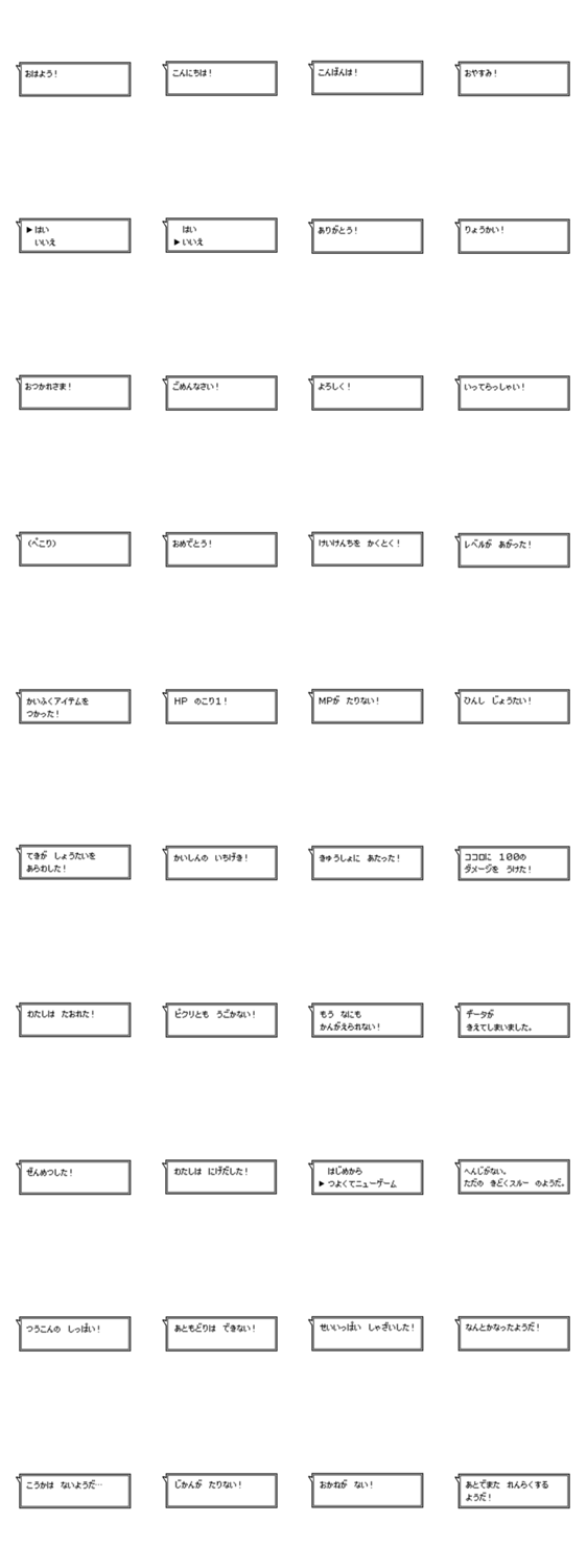 ゲームっぽいフキダシスタンプ。【GAME/画面/ステータス/吹き出し/日常/挨拶/友達/ネタ/面白い/笑える/シュール/ドッキリ/冒険/ファンタジーバトル/クエスト/勇者/主人公】